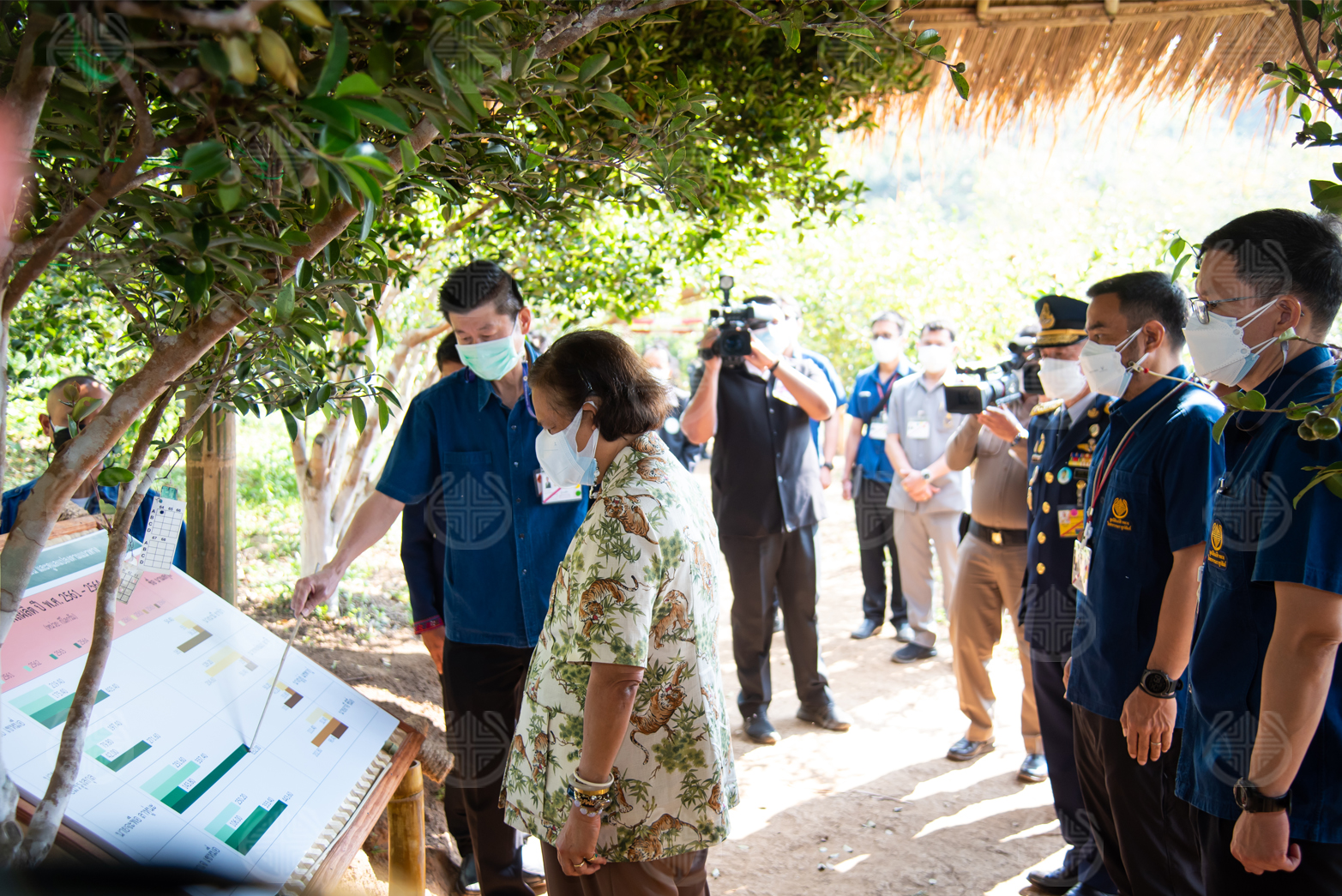 At 1:45pm, the Princess arrived at Ban Pa Sang Na Ngern School, Ban Pa Sang Na Ngern Village, Mae Fah Luang Sub-district, Mae Fah Luang District, where she was welcomed by Thanphuying Putrie Viravaidya, Chairman of the Board of Directors, Mae Fah Luang Foundation; Mr. Veerathai Santiprabhob, Secretary-General; and Khunying Puangroi Diskul na Ayudhaya, member of the board. The Princess chaired a meeting for the School Development Project in the vicinity of Doi Tung Development Project and outreach areas in Mae Fah Luang District for the academic year 2021. Operation results for 2021 covered the following topics: